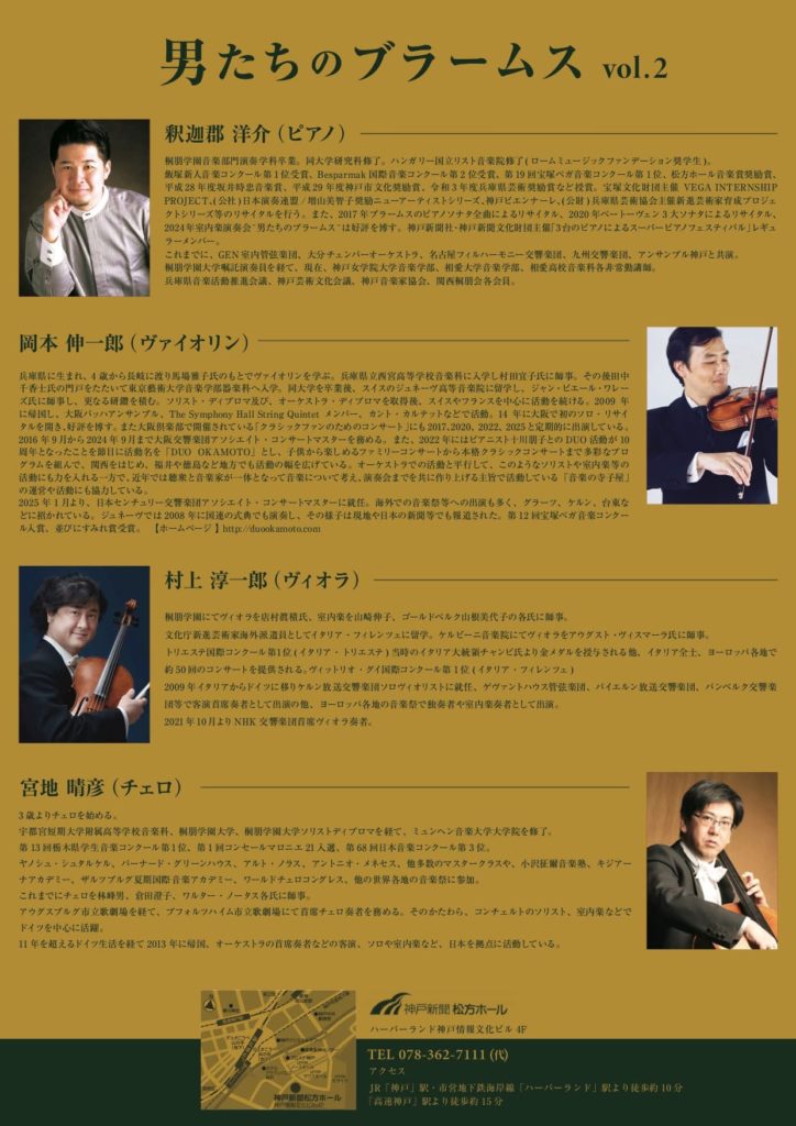 2025年12月6日(土) «男たちのブラームス»室内楽演奏会のご案内☆ 岡本伸一郎 出演公演 2025.10.302025.11.01 第二回目となります【男たちのブラームス】の演奏会に出演いたします!同年代で活躍する仲間達との熱い演奏をご期待ください(^^)♪チケットのお取り置きは【お問い合わせ】からも承っております♪ 【日程】 2025年12月6日(土)【場所】 神戸新聞 松方ホール【時間】 14:30開場 15:00開演【チケット】 一般/4000円 松方ホール友の会会員/3500円チケットのお申込みは、デュオオカモトホームページの【お問い合わせ】からも承っております。