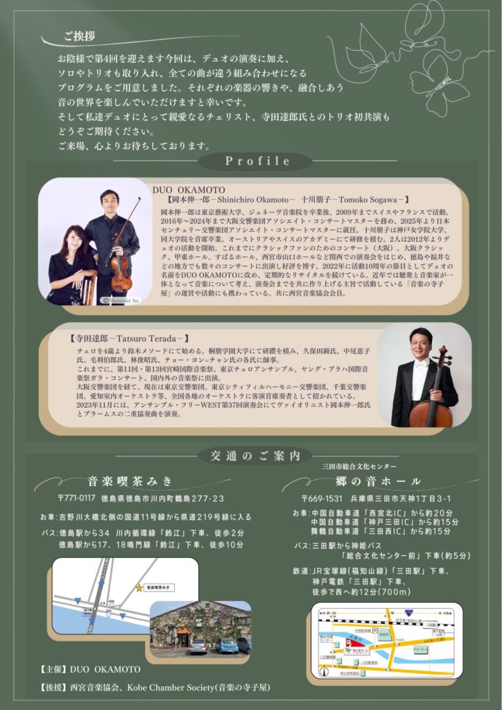おかげ様で今回で第4回目となりました!今年はヴァイオリン、チェロ、ピアノのそれぞれに違った音色の融合をお楽しみください。新たなデュオオカモトの一面を皆様にお届けできますように(^^♪